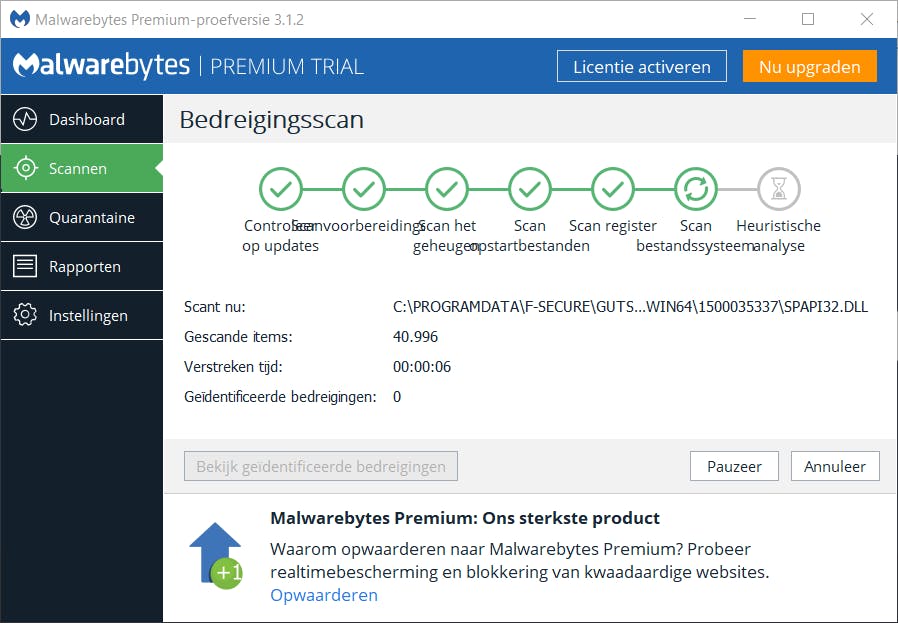 De eerste stap om te voorkomen dat je gevolgd wordt, is om een antivirusscan uit te voeren. Als je al een bestaand antivirusprogramma hebt, start het dan en voer een volledige scan uit. Raadpleeg daarvoor de handleiding van je antivirussoftware. In Windows Defender in Windows 10 klik je rechtsonder op het schildje en ga je naar Virus- en bedreigingsbeveiliging / Geavanceerde scan. Kies dan Volledige scan en klik op Nu scannen. Heb je liever een second opinion, dan kun je eens kijken naar Malwarebytes Anti-Malware. Download de gratis versie, voer het uit en volg de installatiestappen, die spreken voor zich. Open het programma vanuit het systeemvak en klik eerst op Updates: Actueel om updates binnen te halen. Ga dan naar Scannen en klik op Start scan.