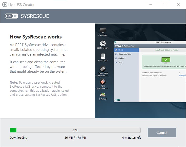 Een antivirusscan is nuttig, maar niet helemaal waterdicht. Om meer zekerheid te krijgen, is het een goed idee om in Veilige modus te starten en dan een scan uit te voeren. Je kunt eventueel gratis een ESET-offlinescan doen. Download het programma door te kiezen voor Live CD/USB Creator, en voer het uit. Plaats een geschikte usb-schijf of -stick in de pc en klik op Create USB drive. Kies de schijf uit de lijst en klik op Create USB drive. Let op dat alle data op de gekozen schijf verwijderd worden! Klik op Yes om te bevestigen en wacht totdat de usb-schijf/stick klaar is. Herstart daarna je pc en start op vanaf usb. Je kunt via F11 of Delete in het bootmenu van je moederbord komen. Check voor de juiste toets even de handleiding van je pc. Kies dan voor de usb-stick om vanaf op te starten. Ga eerst naar het tabblad Update en haal de nieuwste handtekeningen binnen en ga dan naar On-demand scan om een scan te starten.