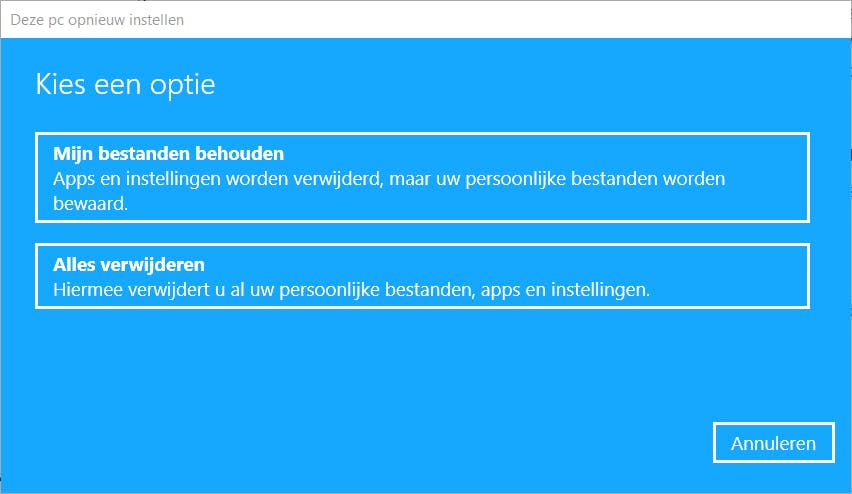 Als je het helemaal niet vertrouwt en bang bent dat er écht iets met je Windows aan de hand is, is de beste optie om Windows opnieuw te installeren. Gelukkig is dat in Windows 10 erg eenvoudig gemaakt. Open hiervoor het menu Start en klik linksonder op het tandwiel om naar Instellingen te gaan. Kies voor de optie Bijwerken en beveiliging en ga links naar Systeemherstel. Klik bij Deze pc opnieuw instellen op Aan de slag. Kies of je je persoonlijke bestanden wilt houden (wij raden aan van wel) en klik een aantal keer op Volgende om het proces te starten. Voordat je hieraan begint, let op dat al je programma’s verwijderd worden. Maak voor de zekerheid een back-up van je belangrijkste bestanden en van eventueel geactiveerde software. Daarna heb je weer een schone pc of laptop, zonder nare software.