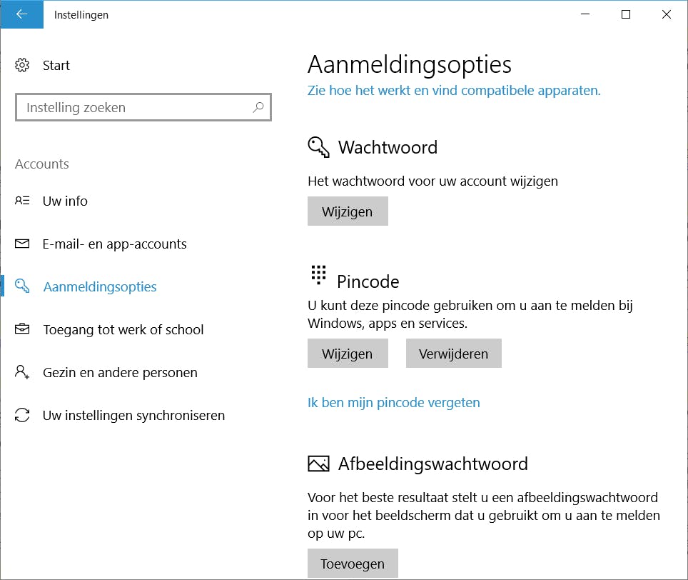 Je kunt natuurlijk al deze stappen volgen, maar stel dat iemand je Windows-wachtwoord weet, heeft het natuurlijk geen zin. Dan kan die persoon alsnog overal bij, doordat je vaak nog actieve sessies in de browser hebt. Je kunt je Windows-wachtwoord wijzigen door naar Instellingen te gaan in Windows 10 en dan te kiezen voor Accounts / Aanmeldingsopties. Klik bij Wachtwoord op Wijzigen. Je kunt eventueel ook een Pincode eronder instellen. Kies er dan wel één van minstens zes cijfers, zodat het veilig is. Langer kan ook.