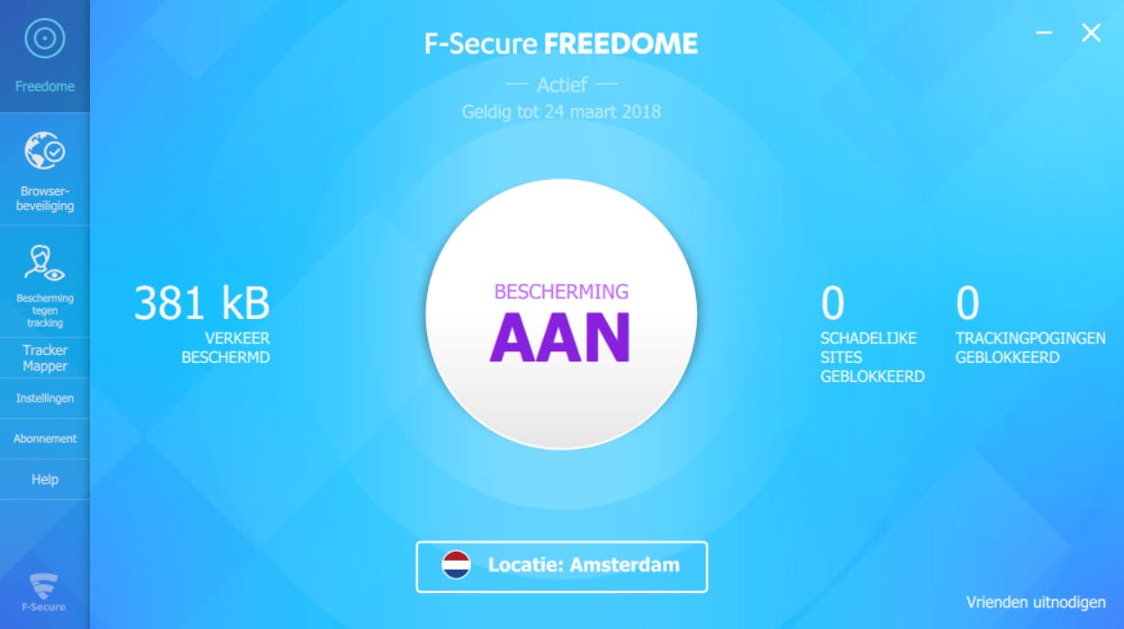 Om te zorgen dat niemand meekijkt met wat je allemaal op internet doet, bijvoorbeeld via de router of via een ander apparaat in het netwerk, kun je een vpn gebruiken. Een vpn versleutelt het internetverkeer tussen de vpn-provider en je apparaat, zodat niemand mee kan kijken. Er zijn veel vpn-diensten om uit te kiezen. Twee gebruiksvriendelijke diensten zijn bijvoorbeeld Goose VPN of Freedome VPN. Vooral die laatste is erg veilig: die is van F-Secure en komt regelmatig goed uit de test. Freedome is beschikbaar voor Windows, macOS, Android en iOS, en is een goede manier om je internetverkeer privé te houden van anderen. Wij downloaden de Windows-client, die je een maand gratis kunt proberen. Download en installeer het programma. Daarna druk je op de grote knop in het midden genaamd Bescherming UIT. Al je internetverkeer is nu versleuteld.