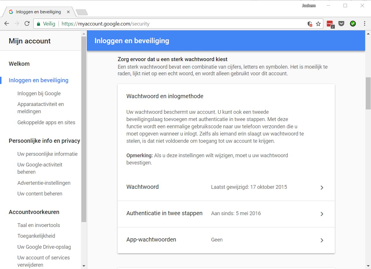 Een andere manier waarop iemand mee kan kijken met wat je doet, is door middel van je online accounts. Als een ongewenst persoon je wachtwoord heeft, kan die inloggen en meekijken in je e-mail of sociale media. Om te voorkomen dat zomaar wordt ingelogd op je accounts, is authenticatie in twee stappen nuttig. Voor Google ga je daarvoor naar https://myaccount.google.com. Klik dan op Inloggen bij Google en klik op Authenticatie in twee stappen. Volg de stappen om het in te schakelen: je kunt codes ontvangen via je telefoonnummer of via de Google Authenticator-app. Voor Microsoft meld je je aan bij https://account.live.com, en daar ga je naar Beveiliging / meer beveiligingsopties onderin. Klik op Verificatie in twee stappen en volg de stappen om het op te zetten. Je kunt ook hier Google Authenticator (ook voor iOS) gebruiken, of Microsofts eigen app.