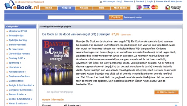 Kijk op je gemak rond in zo'n webshop, plaats de gewenste digitale boeken in het winkelmandje en reken af. Afhankelijk van de winkel krijg je daarna een e-mail met een downloadlink of kun je de boeken meteen vanaf de website downloaden. Bij Bol.com bijvoorbeeld kun je zolang als je met jouw account op de website bent aangemeld bovenin op Mijn account / Mijn ebooks klikken. Daar zie je dan niet alleen de zojuist gekochte boeken, maar ook alle eerder aangeschafte e-books. Via een muisklik zijn ze eenvoudig te downloaden.
