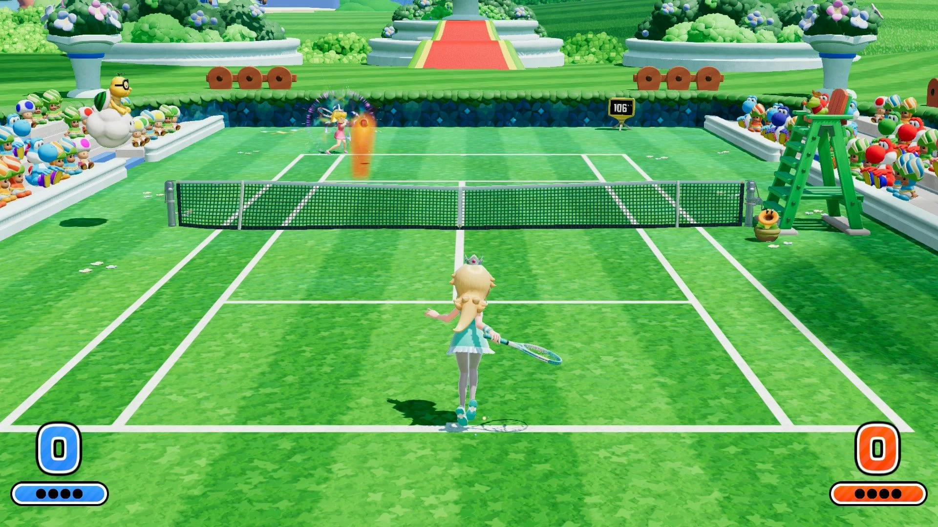 En die banen? Die hebben elk hun eigen ondergrond, waar ballen anders op stuiteren en doorschieten, terwijl spelers zelf ook sneller of minder snel zijn, gebaseerd op het gras of het hardcourt waar ze op spelen. Die Fever-rackets? Oprecht allemaal een andere smaak. Ook daar merk dat extra stukje diepgang waar een wat luiere Mario-sportgame niet aan zou denken: wanneer je een Fever-shot terugslaat vóórdat op jouw zijde van het net landt, kun je met een stuit op de helft van de tegenstander zomaar eens het bijbehorende effect teruggeven. Prettig vervelend als je denkt die koter een modderplas op zijn helft te bezorgen, om ‘m vervolgens zelf om je oren te krijgen als hij de bal vakkundig over je heen lobt en ‘ie alsnog op jouw achterveld terecht komt. Een (modder)koekje van eigen deeg noemen ze dat geloof ik.