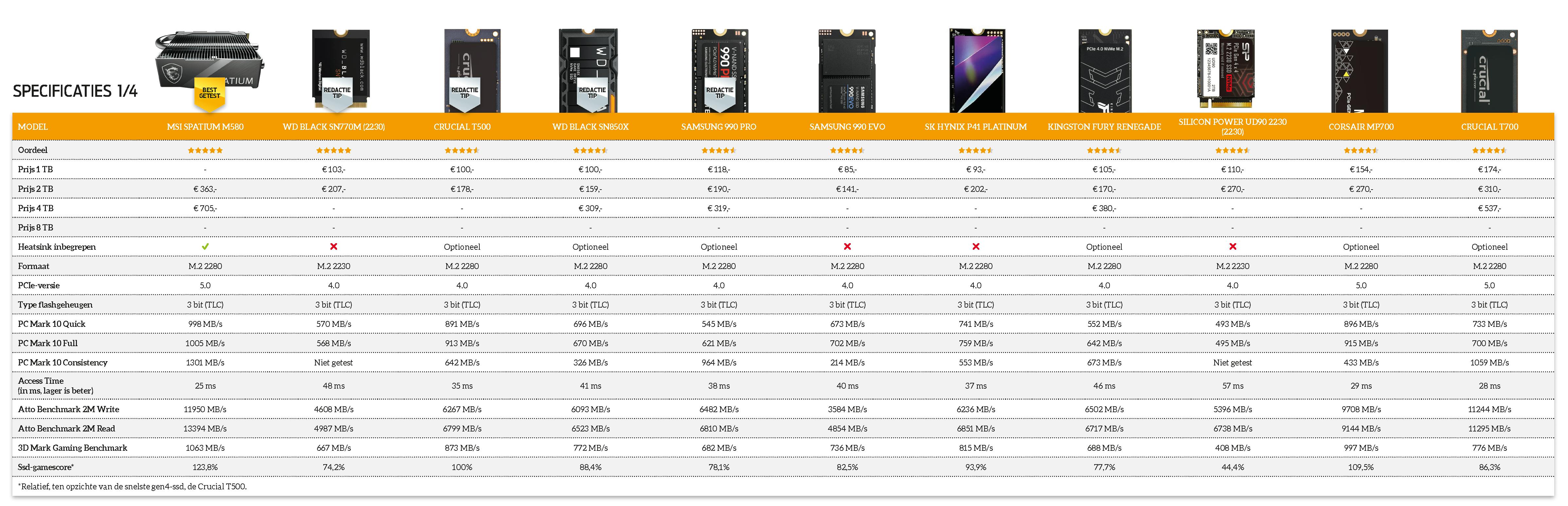 Zoals gezegd is een gen5-ssd zelden de moeite waard, vooral omdat ze vooralsnog heel veel kosten. Ook het aantal applicaties dat profiteert van de nog betere prestaties ten opzichte van een goede gen4-ssd is klein. Daarbij speelt ook nog eens dat alle high-end gen5-ssd’s dezelfde controller gebruiken, wat de onderlinge verschillen vrij klein maakt. Desondanks is er één de beste, en dat is de eerste ssd met de laatste generatie snelle flashchips die de Nederlandse markt bereikt: de MSI Spatium M580. Structureel de snelste, uiteraard met bijpassend prijskaartje.