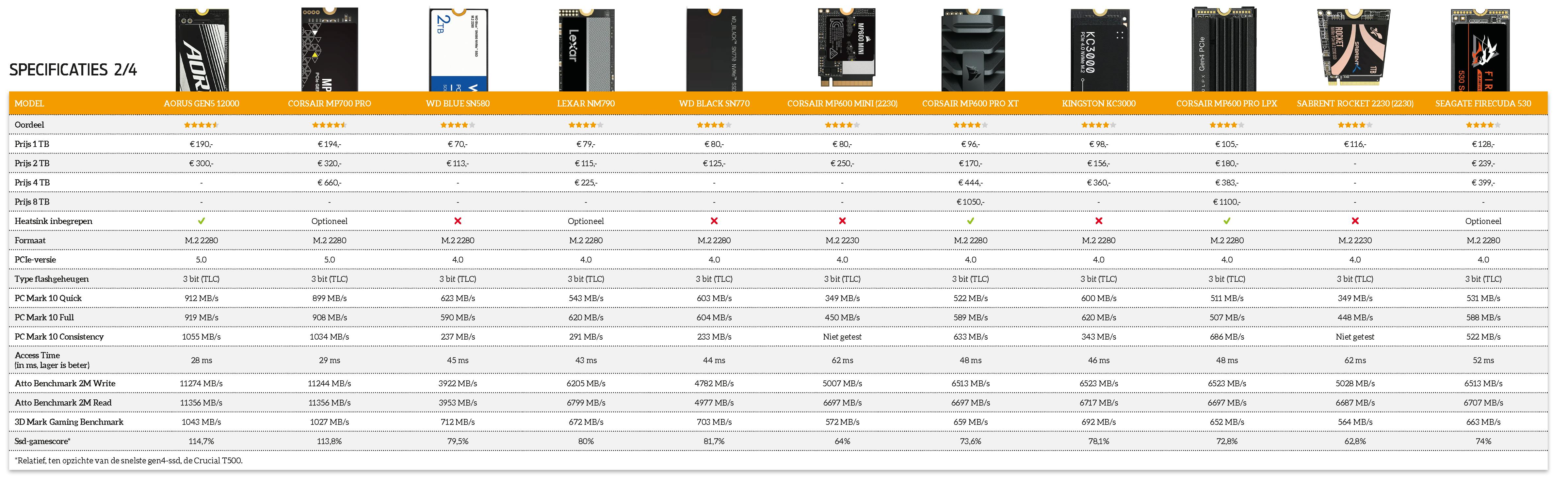 Lang niet alle modellen zijn in meer dan 2 TB leverbaar. Minder concurrentie leidt tot hogere prijzen per gigabyte en grotere verschillen onderling. Maar aangezien de prestaties van de betere opties niet ver uit elkaar liggen, maakt dit de keuze ergens ook weer makkelijker.