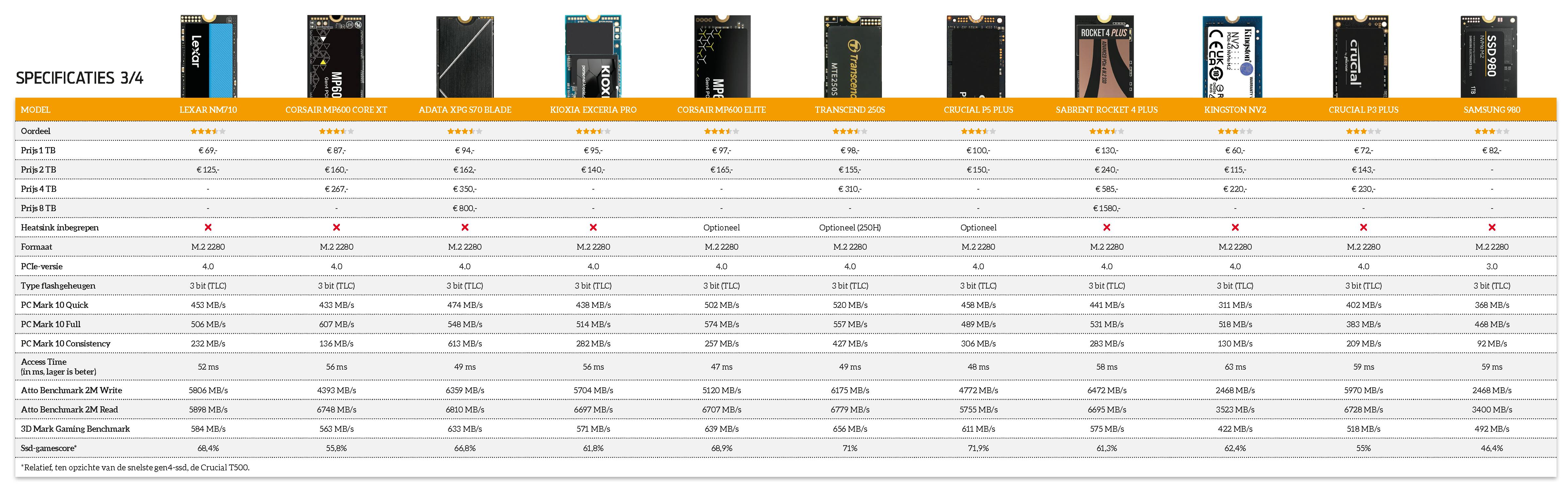 Ben je op zoek naar een extra ssd voor de spelbibliotheek op je pc en geef je liever wat minder uit? Dan kun je eigenlijk met geen enkele van de met 4 of zelfs 3,5 sterren beoordeelde ssd een verkeerde koop doen.