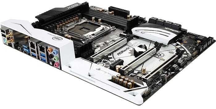 Als basis voor deze socket dient de X99-chipset van Intel. Je kunt maar liefst acht ddr4-modules met een capaciteit van in totaal 128 GB op het moederbord kwijt. Gunstig is dat de fabrikant een Nvidia High Bandwidth sli-brug meelevert voor het geval je met meerdere GeForce GTX 1070- of 1080-videokaarten in sli-modus wilt gamen. Om een zware videokaart te dragen, heeft ASRock de drie pci-express 16x-sloten met aluminium verstevigd.