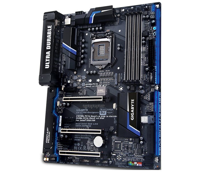 Met de GA-Z170X-Designare (237,90 euro) heeft Gigabyte een atx-moederbord op de markt gebracht met zeer veel mogelijkheden. Als basis dient de Z170-chipset, waarbij er aan de hand van de LGA1151-socket ondersteuning is voor de populaire Skylake-processorreeks van Intel. Daarnaast kun je nog vier ddr4-geheugenmodules met een capaciteit van maximaal 64 GB op dit moederbord kwijt.
