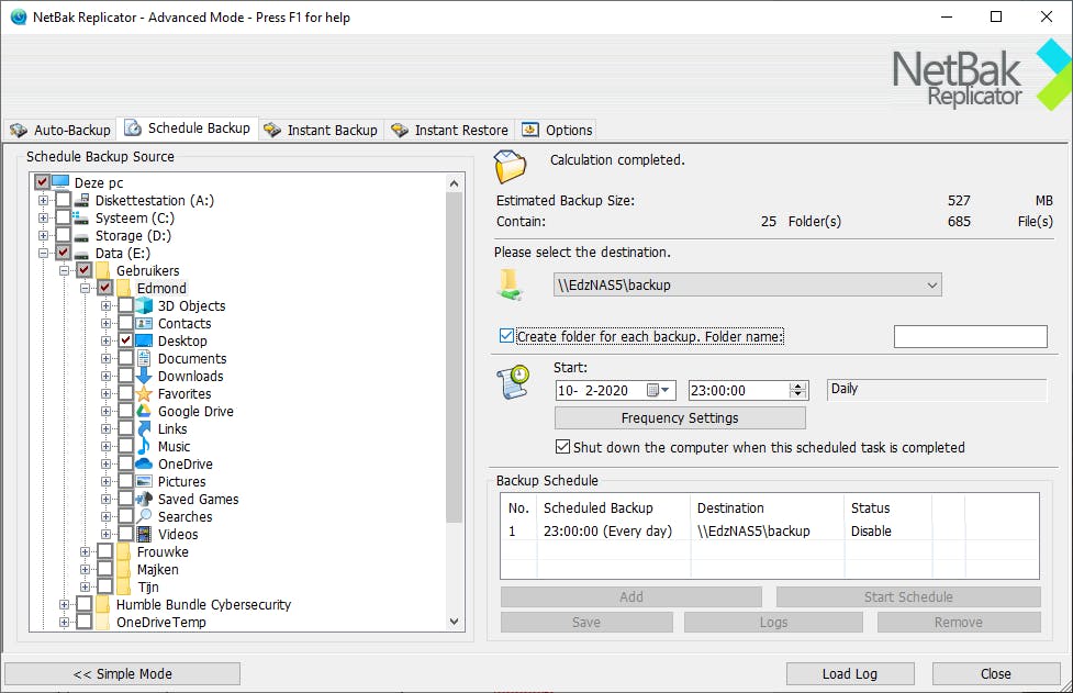 Klik tenslotte op Add om deze back-up aan het schema toe te voegen. Via Close sluit je de wizard. Voortaan zal Netbak Replicator volgens het opgegeven schema de back-up maken. Zorg er wel voor dat op dat moment de nas is ingeschakeld. Zowel bij Synology als Qnap kan dat via een schema voor in- en uitschakelen worden geregeld.