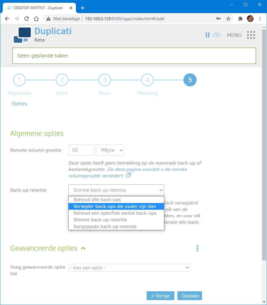 Een venster verder leg je de planning voor deze back-up vast. Bij de optie Voer opnieuw uit iedere […] (bijvoorbeeld iedere 2 Uur) geef je aan na hoeveel tijd Duplicati moet checken of er bronbestanden zijn aangepast of gecreëerd. In het volgende venster stel je bij Back-up retentie in hoeveel back-upversies je wilt bewaren. Leg je keuzes vast met Opslaan en test de back-up uit met Uitvoeren.