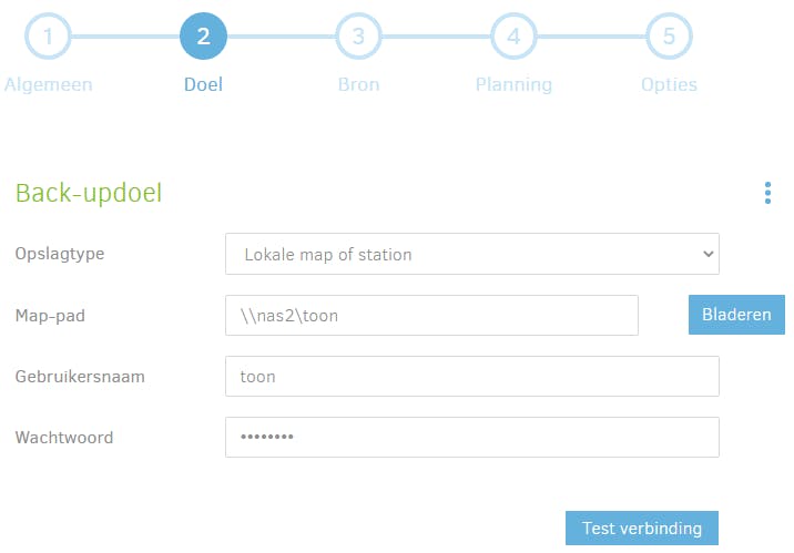 Gaat het om een share op je NAS, dan ondersteunt die wellicht ook (S)FTP-connecties, wat nog veiliger is. Bij Opslagtype dien je in dit geval wel FTP te selecteren, waarna je bij voorkeur een vinkje plaatst bij Gebruik SSL. Bij Server en poort vul je het ip-adres of de hostnaam van je NAS in evenals het FTP-poortnummer (standaard 21). Ten slotte vul je bij Pad op server de naam van de back-upmap in. Vul tevens Gebruikersnaam en Wachtwoord en controleer de connectie met Test verbinding.