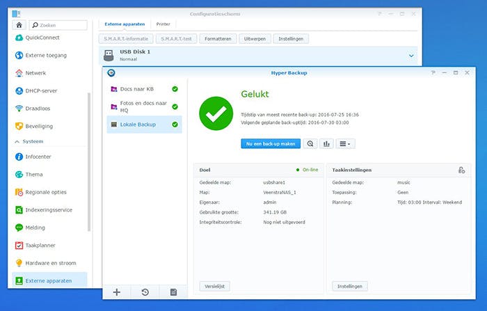 Goed, zorg dat je ingelogd bent met admin-rechten. We gaan ervan uit dat je nu de usb-stick in de NAS hebt gestoken en deze in EXT4 hebt geformatteerd via Configuratiescherm / Externe Apparaten / USB Disk, en dat Hyper Backup geïnstalleerd is (installeer dat eventueel handmatig via het Package Center).