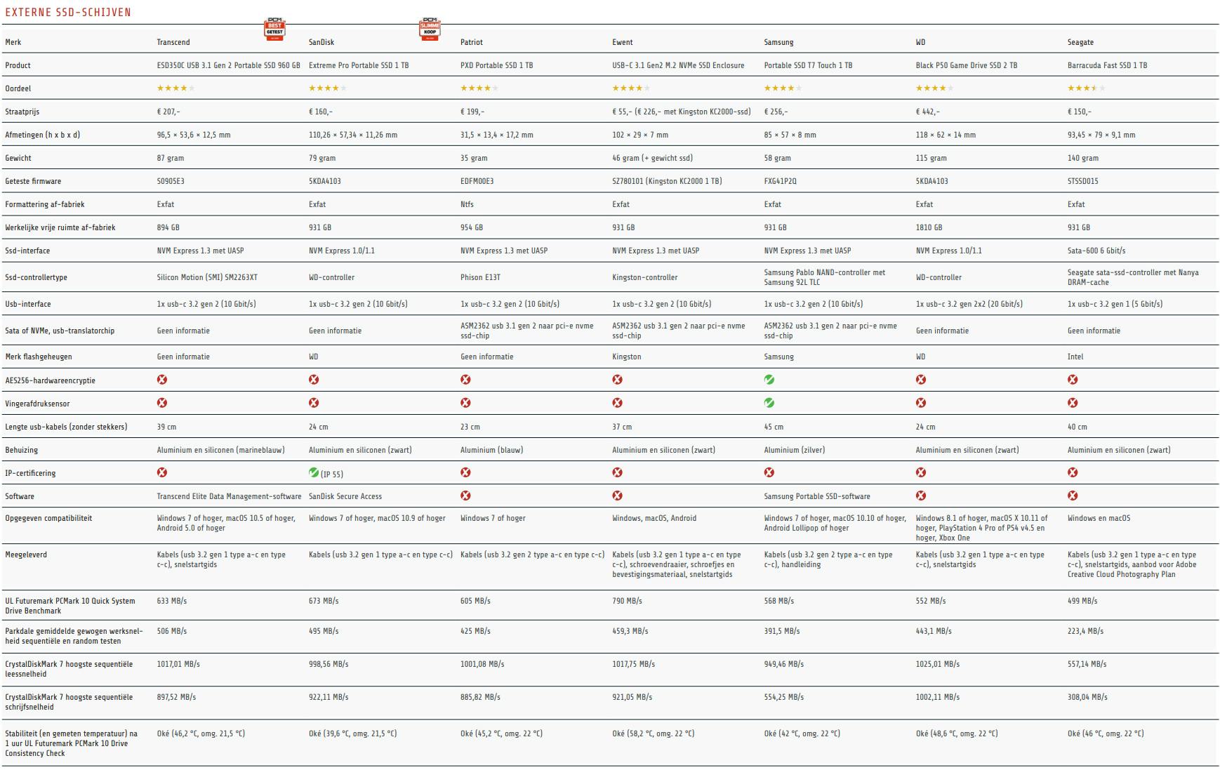 Zelfs de traagste externe ssd is vele malen sneller dan een externe harde schijf. De Transcend ESD350C krijgt het keurmerk Best getest. Hij is iets sneller dan de goedkopere SanDisk Extreme Pro Portable SSD, die de beste verhouding tussen prijs en kwaliteit biedt en terecht het keurmerk Slimme koop krijgt.