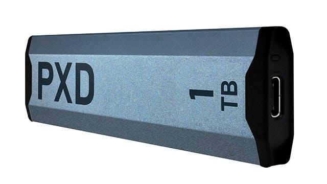 De Patriot PXD Portable SSD is niet veel groter dan een usb-staafje en biedt tot 2 TB opslagcapaciteit voor het duurste model. Wij testen de 1TB-variant. Er is nog een goedkopere versie met 512 GB capaciteit. Dankzij een 10Gbit/s-poort (usb-c 3.2 gen 2) zijn hoge doorvoersnelheden haalbaar tot wel 1.000 MB/s. De blauwe aluminium behuizing is minder dan 1,8 cm dik.
