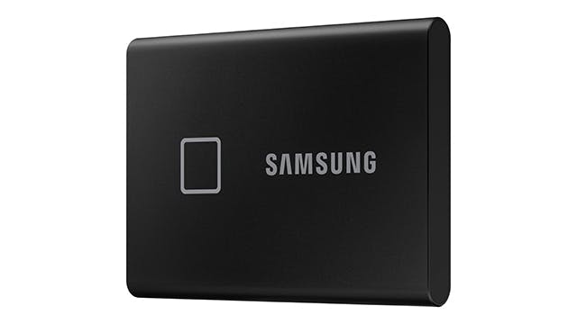 De Samsung Portable SSD T7 Touch past gemakkelijk in de palm van je hand. Gegevens kun je hardwarematig versleutelen met aes256-encryptie. Boven op de aluminium behuizing, naar keuze verkrijgbaar in zilver of zwart, bevindt zich een vierkante vingerafdruksensor, omgeven door een blauw led-kader dat oplicht wanneer het schijfje aangesproken wordt door een computer of een smartphone (‘Motion LED’).