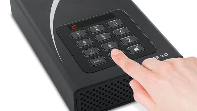 Bovenop deze externe harde schijf pronkt een toetsenblok. Alleen door de juiste code in te typen, krijg je toegang tot alle opgeslagen gegevens. De Aegis Padlock DT gebruikt als versleutelingsmethode XTS-AES-256-encryptie.