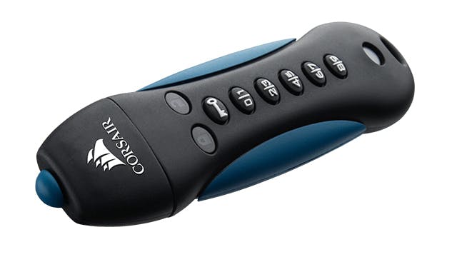 Corsair brengt met zijn Flash Padlock 3 een betaalbare usb-stick met hardwarematige versleuteling op de markt. De 16GB-uitvoering kost bij de meeste verkoopadressen iets meer dan vijftig euro, maar voor twee á drie tientjes extra kun je ook 32 of 64 GB opslagruimte overwegen. Er is daarnaast nog een uitvoering met 128 GB opslagcapaciteit, hiervoor hanteert Corsair een adviesprijs van 139,99 euro. De rubberen behuizing bevat numerieke toetsen waarmee je een pincode kunt invoeren. Als versleutelingsmethode gebruikt deze waterbestendige usb-stick AES-256-encryptie.