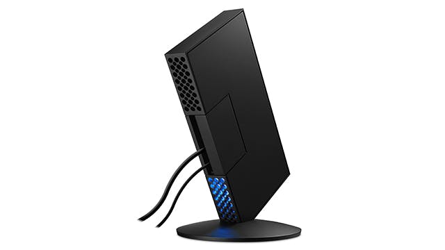 De Bolt3 oogt ietwat merkwaardig, omdat LaCie een nogal bijzondere voet heeft ontwikkeld. Hierop zet je deze externe ssd-schijf namelijk schuin neer, waardoor het net lijkt of het apparaat ieder moment kan omvallen. Bij de onderste koelgaten is er blauwe verlichting zichtbaar die dankzij het schuine ontwerp naar beneden straalt. Hierdoor is het licht goed zichtbaar op bijvoorbeeld een bureaublad.