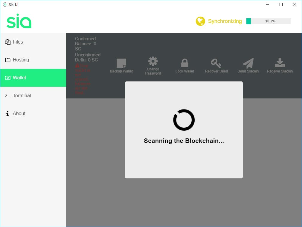 Op de site van Sia kun je kiezen uit de grafische interface of een daemon voor de command line. Wij kiezen de eerste. Bij de eerste start moet je een Wallet aanmaken. Kies voor Wallet / Create a new wallet en stel een wachtwoord in. Daarna gaat Sia de blockchain downloaden en verifiëren. Dit vereist een download van ongeveer 6 GB en neemt wat tijd in beslag. Zolang deze verificatie loopt, kun je met Sia zelf niets doen. Je kunt wel alvast wat cryptovaluta inkopen.