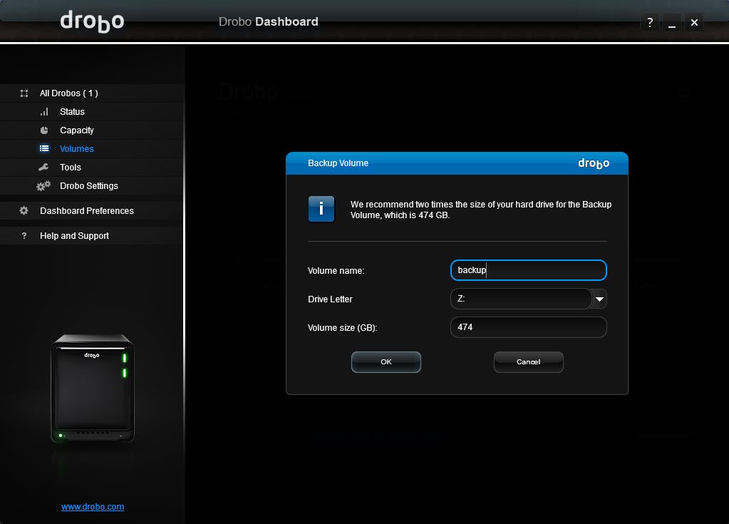 Om back-ups volledig gescheiden te houden van de normale externe opslag kun je met behulp van Drobo Dashboard een apart back-upvolume creëren. Standaard heeft dit tweemaal de omvang van de harde schijf in je computer, maar je mag dit natuurlijk vergrootten. De Drobo moet wel een keer herstarten om het volume, dat in principe de Windows-driveletter Z meekrijgt, te activeren. De hele operatie duurt maar een minuut of drie. Voor de back-upsoftware moet je wel zelf zorgen. Windows Backup and Restore en macOS Time Machine worden in elk geval ondersteund.