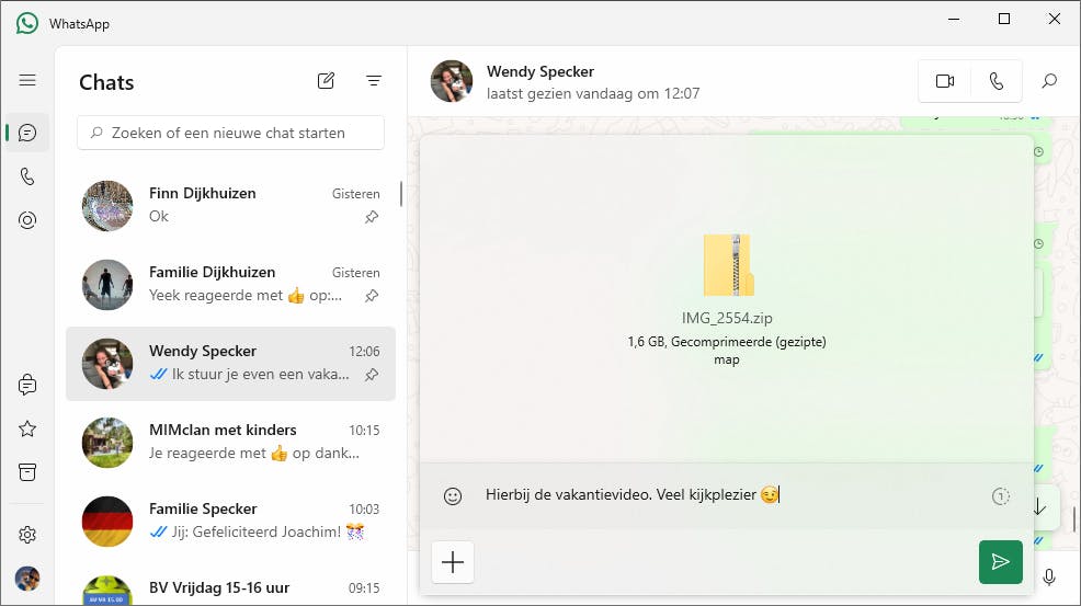 Heel veel mensen hebben WhatsApp. Handig, want je kunt met deze chatdienst heel makkelijk bestanden delen. Ook video’s, foto’s en documenten die op je computer staan opgeslagen, stuur je moeiteloos naar bekenden. Er geldt weliswaar een bestandslimiet van 2 GB, maar voor een fotoalbum of korte video is dat veelal voldoende.