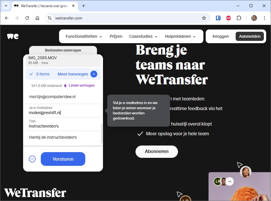 - Upload tot 2 GB naar WeTransfer of tot 50 GB met SwissTransfer