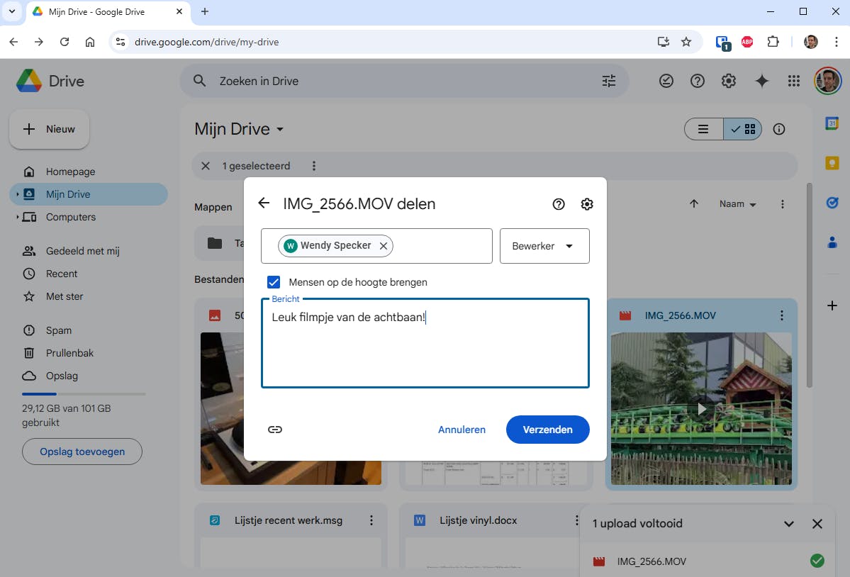 Typ bovenaan in het lege veld een of meerdere namen van contactpersonen naar wie je de gegevens wilt versturen. Als je de maildienst Gmail gebruikt, herkent Drive vermoedelijk al heel wat vrienden, familie, collega’s en overige bekenden. Je kunt ook een volledig e-mailadres intikken. Laat optioneel een persoonlijk bericht achter en bevestig met Verzenden. Klik als laatste zo nodig op Toch delen.