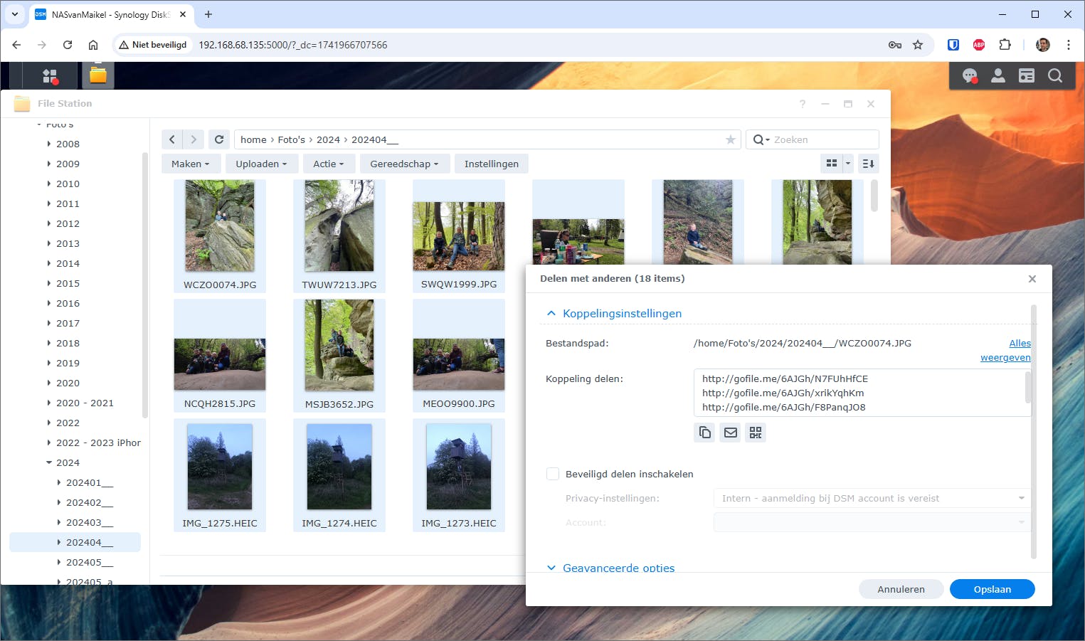 We geven een voorbeeld met een Synology-NAS: log vanuit de browser in op het besturingssysteem DiskStation Manager. Selecteer in de app File Station een of meerdere mappen of bestanden. Je navigeert daarna in de menubalk naar Actie / Delen. Je kunt de weergegeven link(s) kopiëren en vervolgens sturen naar bekenden. Bekijk de resterende opties om onder meer een vervaldatum en wachtwoord in te stellen. Sluit het venster met Opslaan. Via het envelopje kun je de downloadlinks als alternatief ook mailen. Hiervoor is het wel een voorwaarde dat er een e-mailaccount op de NAS is ingesteld.