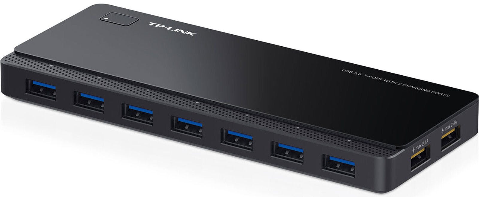 Zoek je een uitgebreide usb-hub voor een scherpe prijs? Dan is de breed verkrijgbare TP-Link UH720 wellicht het overwegen waard. Met zeven reguliere usb-a-aansluitingen en nog eens twee oplaadpoorten kun je alle kanten op. Aan de witte ledlampjes kun je zien of de usb-stick, printer en toetsenbord succesvol zijn verbonden. Volgens de fabrikant ondersteunt dit apparaat een respectabele overdrachtssnelheid tot 5 Gbit/s. Een geruststellende gedachte is dat de usb-hub is beveiligd tegen oververhitting en overspanning. De afmetingen van 16,5 × 6,55 × 1,75 centimeter vallen trouwens mee, waardoor de hub moeiteloos in een tas past.