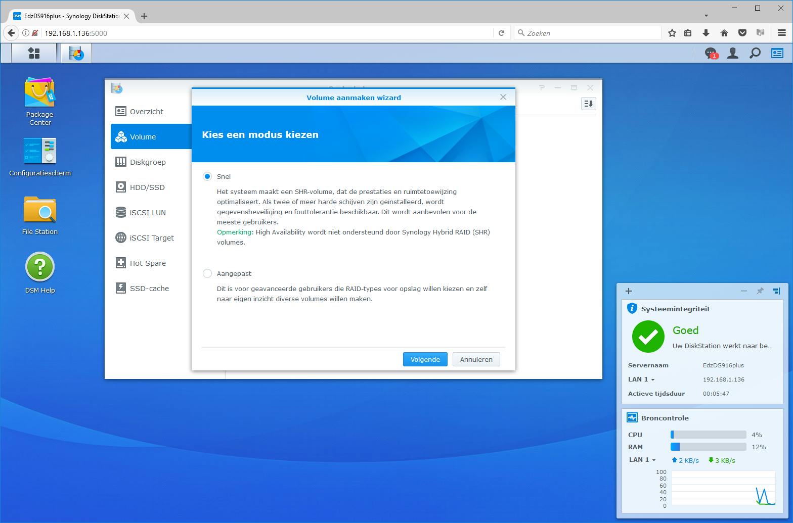 De precieze werkwijze verschilt per merk, maar bijna elke nas-installatie begint met het inloggen op de webinterface van de nas. Hierna volg je een configuratiewizard die je helpt om alle belangrijke instellingen zoals naam en netwerkconfiguratie en dus ook de keuze in de opslag te bepalen. Kies bij een nas met twee schijven voor raid1 en bij een nas met vier of meer schijven voor raid5.