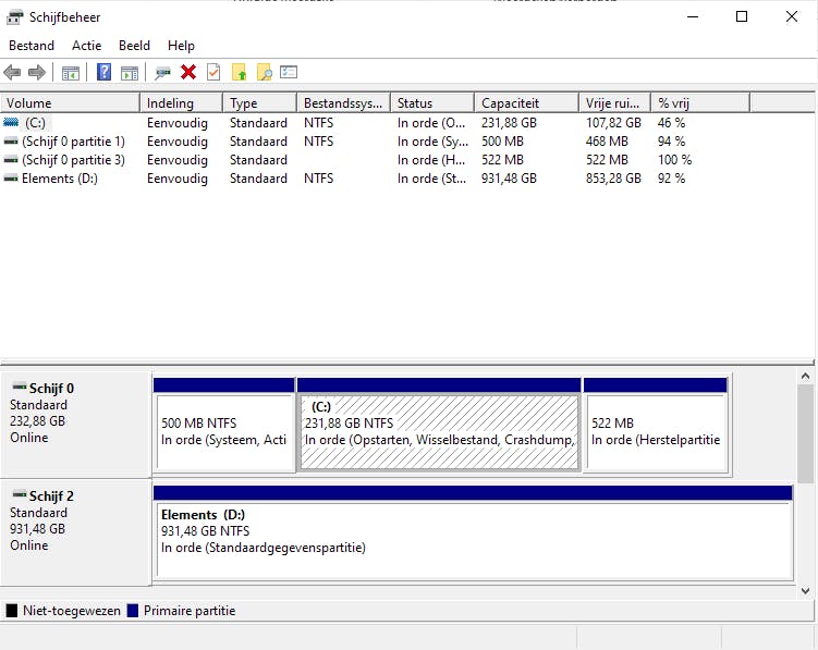 Schijfbeheer ziet er op beide besturingssystemen hetzelfde uit. Als de externe schijf een stationsletter heeft gekregen, dan wordt die hier naast de stationsnaam weergegeven. Is er geen stationsletter, voer dan de volgende stap uit.