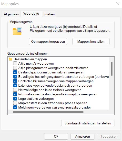 In Windows 11 zijn de Mapopties ook nog steeds toegankelijk via Verkenner. Klik bovenaan op de knop met de drie puntjes en selecteer uit dit menu Opties. Daarna krijg je hetzelfde venster te zien als in Windows 10 en kun je op het tabblad Weergave het vinkje verwijderen bij Lege stations verbergen.