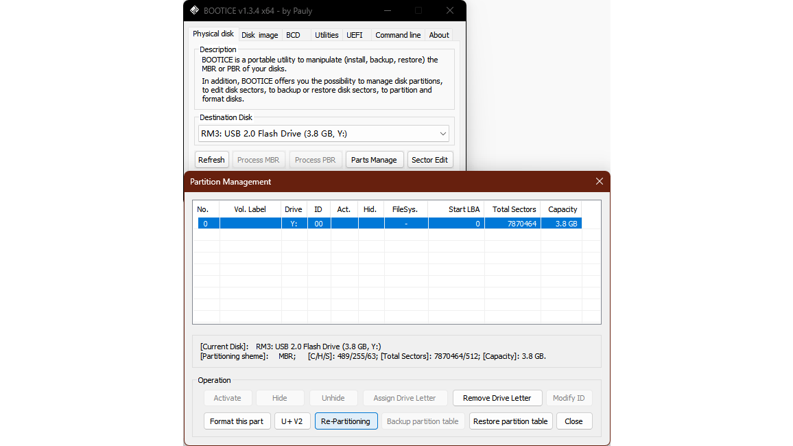 - BootIce: verwijs bij Destination Disk naar je usb-stick, klik op Parts Manage / Re-Partitioning, kies bij voorkeur USB-HDD mode - Single Partition, bevestig en wacht tot Formatting is successful verschijnt.