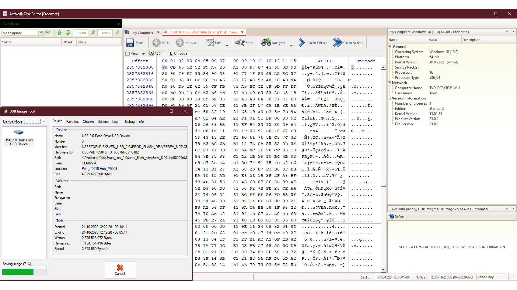 Als dit niet de gehoopte resultaten oplevert, kun je een meer handmatig dataherstel proberen. Download en installeer hiervoor de gratis tool Active@Disk Editor (voor Windows en Linux) en start hem. Kies Open Disk Image en navigeer naar het img-bestand via de knop met de drie stippen. Klik op het pijlknopje rechtsonder, selecteer All Files (*.*) en open het img-bestand. Hiermee kun je de binaire inhoud van de schijfkopie bekijken, door sectoren bladeren, en desgewenst gegevens wijzigen of kopiëren.