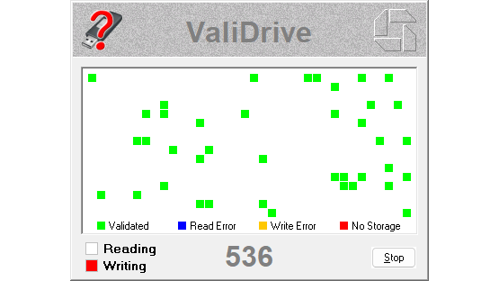 Controleer de daadwerkelijke opslagcapaciteit met de gratis tool ValiDrive. Klik op Check USB Drive / Validate THIS drive, waarna een hele reeks lees- en niet-destructieve schrijfoperaties worden uitgevoerd, gevolgd door een beknopt rapport. Op de site van de maker staat hierover uitgebreide informatie. We ondervonden helaas dat deze tool usb-sticks niet altijd blijkt te detecteren.