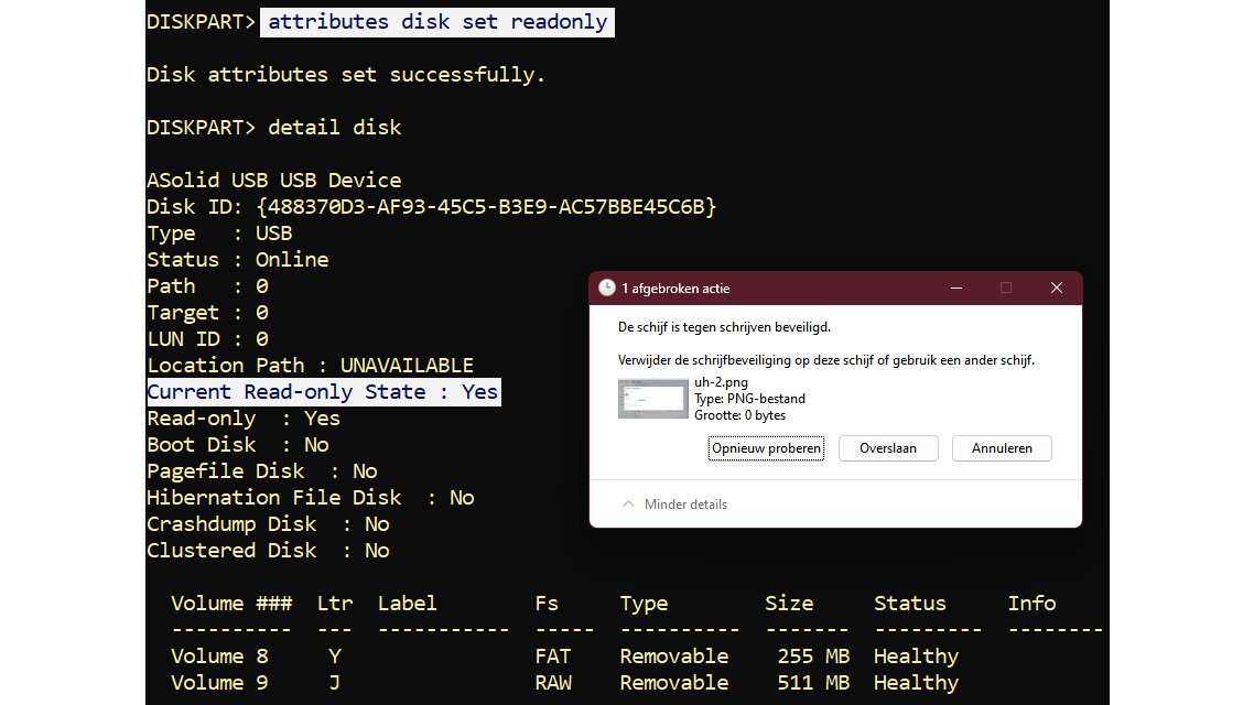 Vervang # door het schijfnummer van je usb-stick, dat in de uitvoer van het eerste commando wordt weergegeven. Als je in de uitvoer van het derde commando Read-only: YES ziet staan, is de usb-stick inderdaad beveiligd tegen schrijven. Voer dan het volgende commando uit:
