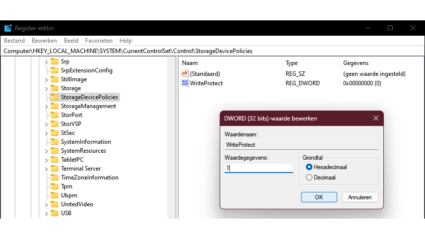Na deze stappen kun je niet meer naar nieuw aangesloten usb-sticks schrijven, tenzij je de WriteProtect-waarde weer op 0 instelt.