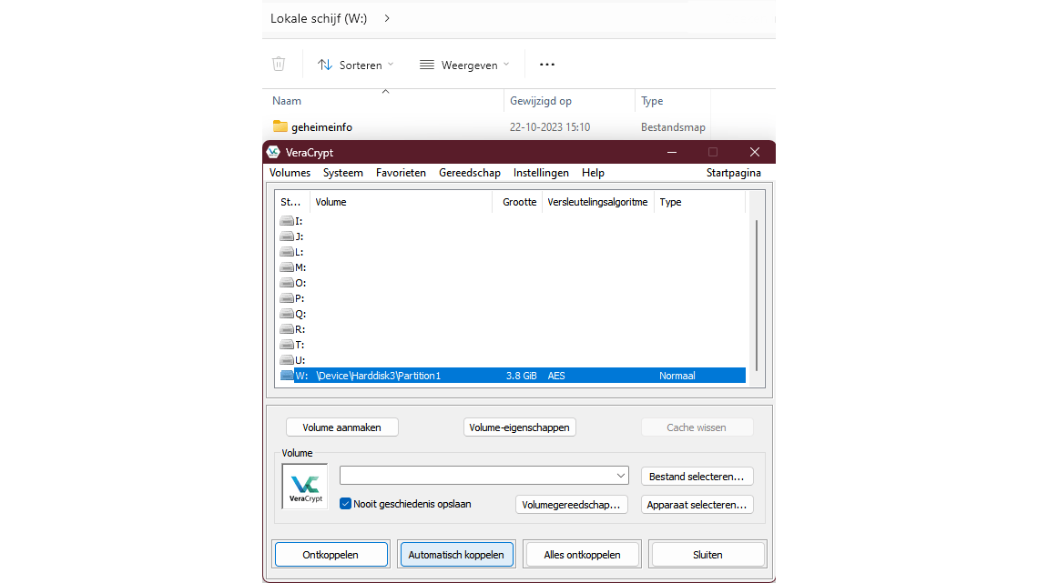 Laat de voorgestelde encryptie- en hash-algoritmen geselecteerd en voer een sterk volumewachtwoord in (tweemaal). Selecteer het gewenste bestandssysteem, zoals exFAT of NTFS. Zodra de voortgangsbalk groen kleurt, klik je op Formatteren. Neem na afloop de informatie door in het dialoogvenster dat verschijnt. Om de usb-stick te koppelen in VeraCrypt, kies je een vrije stationsletter en klik je op Automatisch koppelen, waarna om het wachtwoord wordt gevraagd.