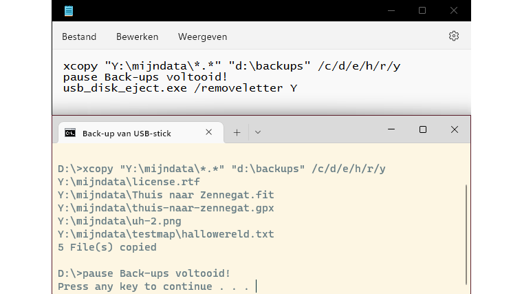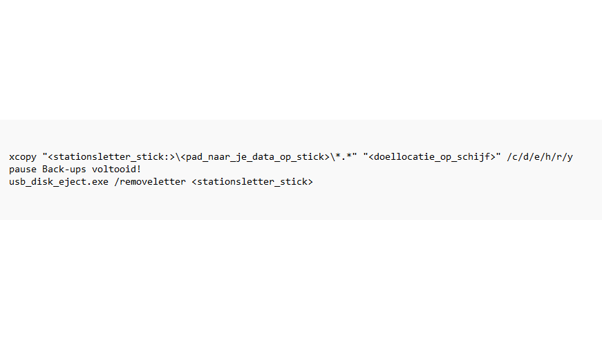 Als je regelmatig gegevens op je usb-stick wijzigt of onderweg nieuwe bestanden toevoegt, is het verstandig om een back-up te maken, bijvoorbeeld zodra je weer achter je desktop-pc zit. Je kunt dit proces enigszins automatiseren, bijvoorbeeld met een eenvoudig batchbestand dat niet alleen voor de back-ups zorgt, maar samen met de gratis tool USB Disk Ejector de usb-stick automatisch (softwarematig) ontkoppelt na de back-ups. Dat is namelijk veiliger in verband met mogelijke ransomware-infecties.
