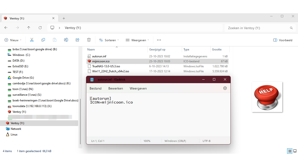 Zorg in ieder geval dat je het ico-bestand in de root van je usb-stick plaatst. Start Kladblok en typ je de volgende twee regels: