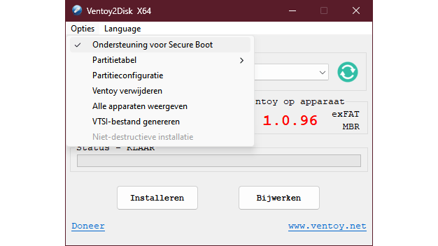 Opstartproblemen met een bootstick lossen zichzelf soms ook vanzelf op door een 64bit-livesysteem op de usb-stick te plaatsen, in plaats van een 32bit-versie. En de opties van de tool waarmee je de bootstick maakt, zijn ook belangrijk. YUMI exFAT en Ventoy zijn de betere tools: niet alleen is multiboot mogelijk, doorgaans kunnen deze usb-sticks zowel op BIOS- als UEFI-systemen opstarten, zelfs met Secure Boot ingeschakeld. Check bij Ventoy wel of in de opties het item Ondersteuning voor Secure Boot is aangevinkt.