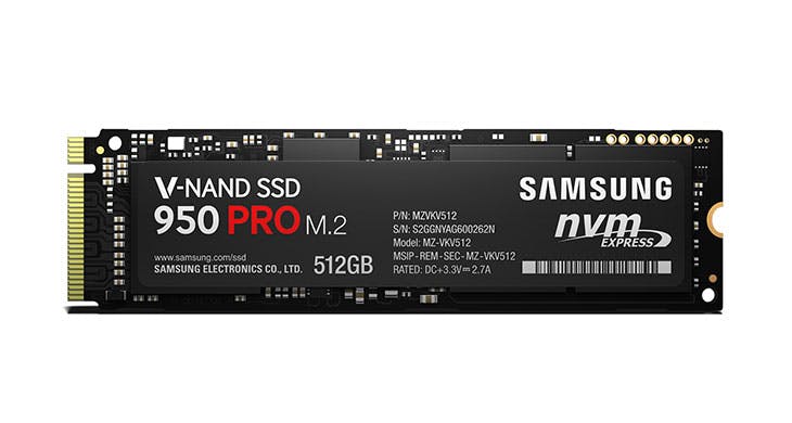 In deze test staat de Samsung 950 Pro SSD met een opslagcapaciteit van 256 GB centraal. Dat is een NVMe-SSD die gebruikmaakt van vier lanes van PCIe 3.0. De 950 Pro SSD is een M.2-schijf, waarbij M.2 een kleine formfactor is bedoeld om te verbinden met PCIe. De SSD-controller van de 950 is Samsung UBX, die verantwoordelijk is voor het aansturen van het 3D V-Nand-flashgeheugen in de SSD. De beloofde sequentiële lees- en schijfsnelheden zijn respectievelijk 2200 MB/sec en 900 MB/sec en de 4k random lees- en schijfsnelheden komen neer op 300.000 en 110.000 input-output operaties per seconde (IOPS).