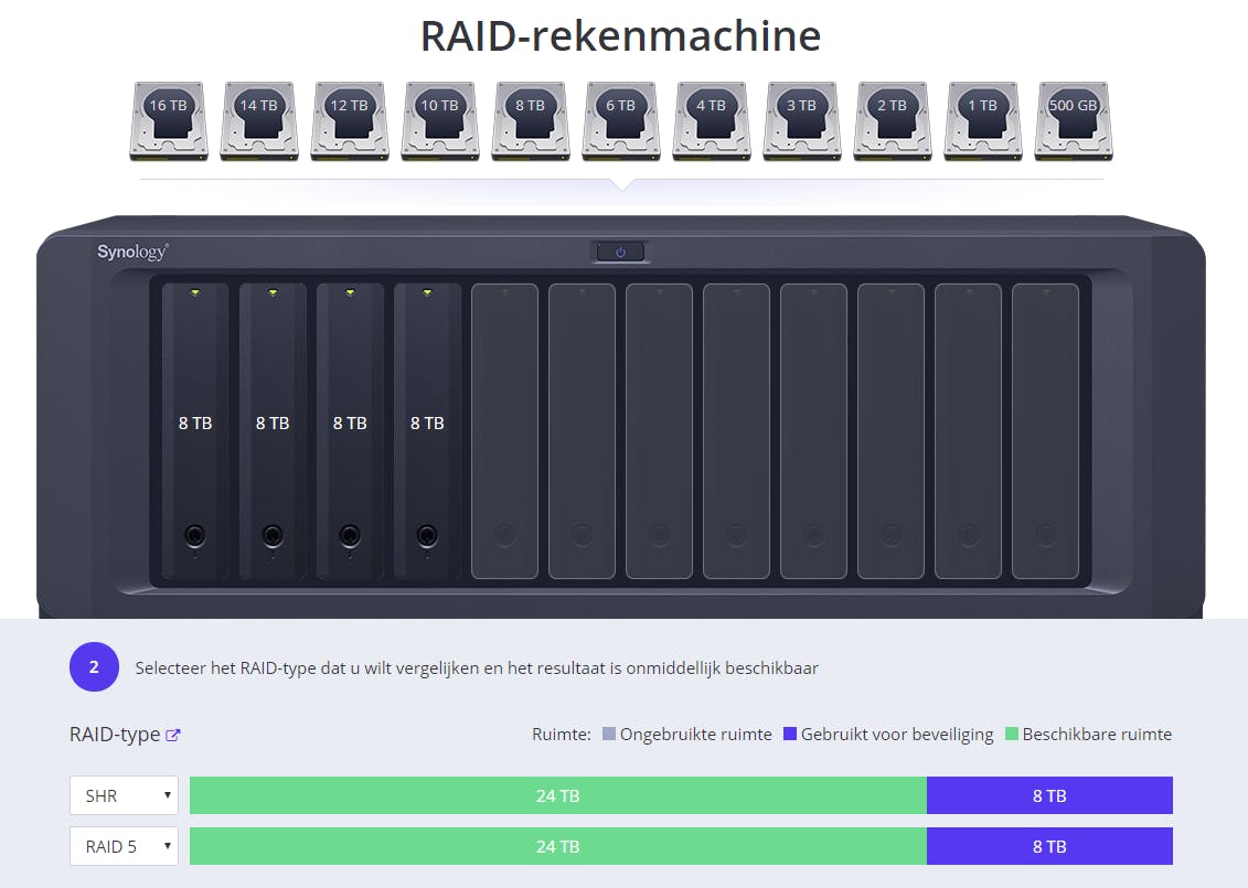 Omdat de bescherming die raid toevoegt een deel van de opslagcapaciteit gebruikt, is het belangrijk de optimale configuratie te kiezen. Met een online nas-calculator zie je al snel hoeveel opslagcapaciteit je kwijtraakt aan de bescherming van de gegevens.