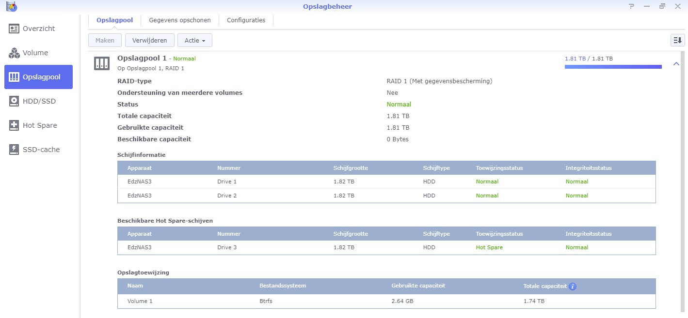 Een aantal nas-merken hanteert nog een begrip, de storagepool of opslagpool. Sterker nog, maak je op een QNAP of Synology een volume dan vraagt de wizard ook om op welke storagepool je dat volume wilt maken, en is er nog geen volume, dan maakt de wizard die voor je. Een storagepool zit onder het volume, het is een verzameling van schijven.