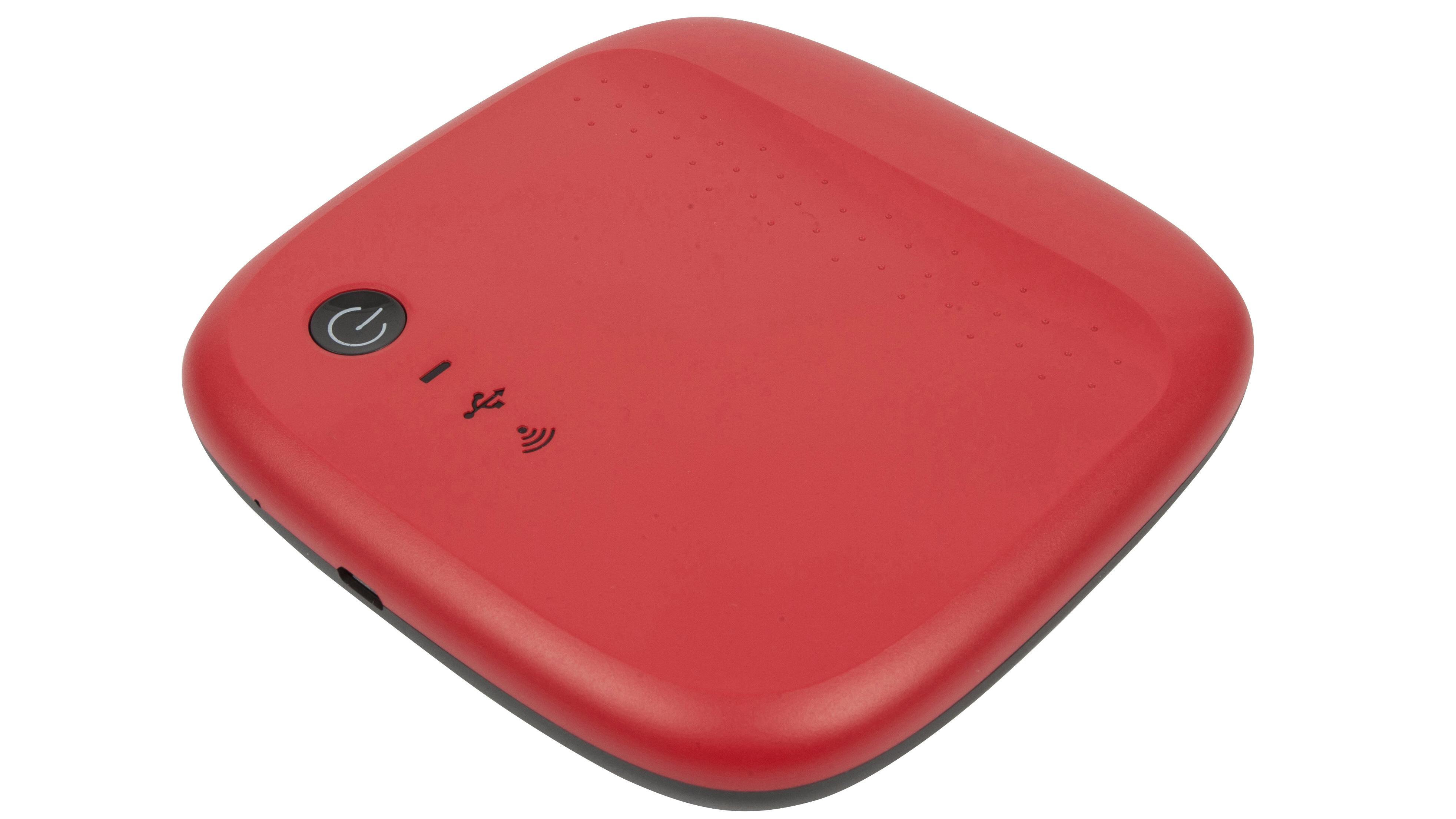 De Seagate Wireless, uitsluitend verkrijgbaar met een capaciteit van 500 GB, past net in de palm van een flinke hand. Deze van kunststof vervaardigde draadloze harde schijf is verkrijgbaar in antraciet en in vier kleuren: wit, rood, blauw en groen. De onderkant is bij al die kleurvarianten wel gewoon antraciet. Volgens de fabrikant houdt de accu het tot acht uur uit, maar wij kwamen niet verder dan vier uur voor het streamen van hd-video. Gelijktijdig draadloos streamen van hd-video lukte stabiel naar maximaal vier apparaten. De usb-poort van de Wireless ondersteunt alleen usb 2.0-snelheden.