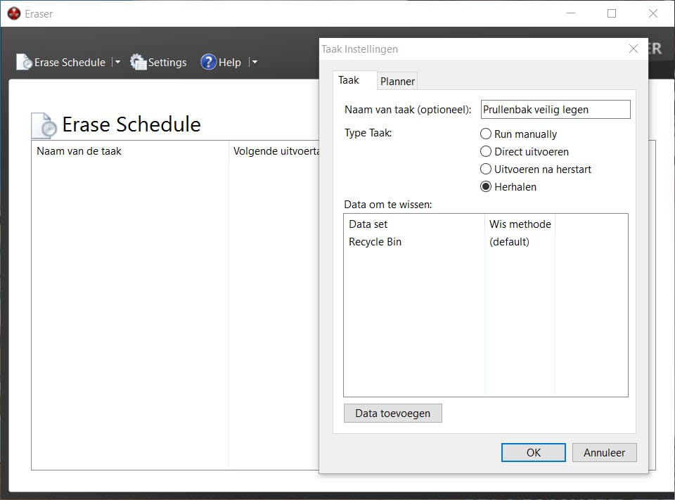 Het hoofdscherm van Eraser opent zich, van waar uit het mogelijk is om taken aan te maken om automatisch verwijderde bestanden veilig te verwijderen. Om zoiets automatisch uit te voeren, klik je op het pijltje naast Erase Schedule bovenaan en kies je voor New Task. Geef de taak een naam, bijvoorbeeld Prullenbak veilig legen. Kies bij Type Taak voor Herhalen en klik onderaan op Data toevoegen om te kiezen wat er verwijderd moet worden. Bij Target Type kun je bijvoorbeeld kiezen om de prullenbak regelmatig veilig te legen. Kies daarvoor voor Recycle Bin.