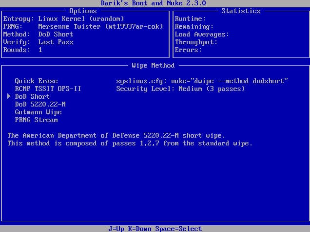 Alternatieven zijn een Gutmann Wipe dat 35 rondes doet, maar dan moet je wel erg paranoïde zijn. Druk op spatie om de methode te bevestigen en druk ten slotte op F10 om het starten met het legen. Dat duurt met DoD Short al gauw 4-8 uur.