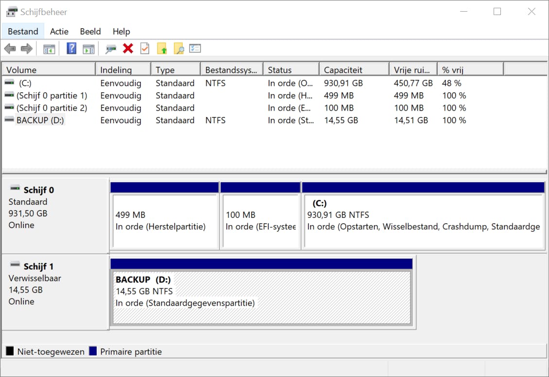 Voordat we serieus gaan beginnen, klik je op Windows-toets+X om naar Schijfbeheer te gaan. Je krijgt dan te zien welke opslagapparaten op de pc zijn aangesloten. Een van die opslagapparaten is de primaire hdd/ssd met daarop de C:-partitie die Windows 10 bevat. Een ander opslagapparaat is dan de usb-stick of de externe harde schijf, waarbij je controleert welk bestandssysteem er wordt gebruikt. Is NTFS dat bestandssysteem? Mooi: “Dan ga je door naar de volgende ronde!”