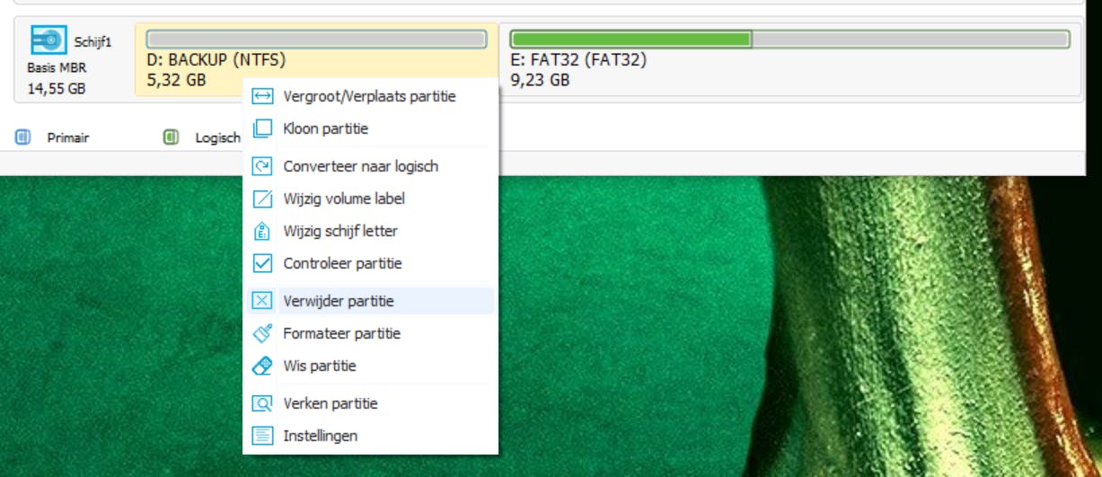 Goed, de NTFS partitie is nu leeg. Klik die lege NTFS-partitie aan met de rechtermuisknop en kies voor Verwijder partitie. Klik de FAT32-partitie aan met de rechtermuisknop en kies voor Vergroot/Verplaats partitie. Geef vervolgens álle vrijgekomen opslagruimte aan de FAT32-partitie. Klik tot slot de FAT32-partitie aan met de rechtermuisknop en maak er een primaire partitie van.